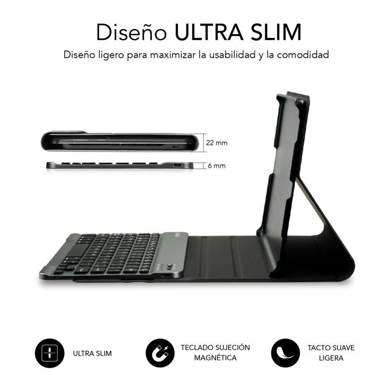 El teclado Bluetooth es extraíble y se adhiere a la funda mediante un sistema de potentes imanes. El sistema de cierre es también mediante una solapa magnética.