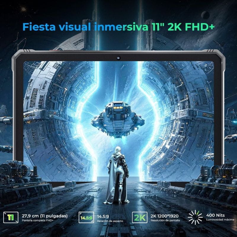 Tablet rugerizada con pantalla IPS 11" 2K 120 Hz, batería de 20080 mAh con carga rápida 20 W, certificaciones IP68/IP69K y MIL-STD-810H, Unisoc S713 5G, 8 GB RAM ampliable a 24 GB, 512 GB ROM, cámara 64 MP y visión nocturna 20 MP, lápiz óptico y luz LED 350 lm incluidos.