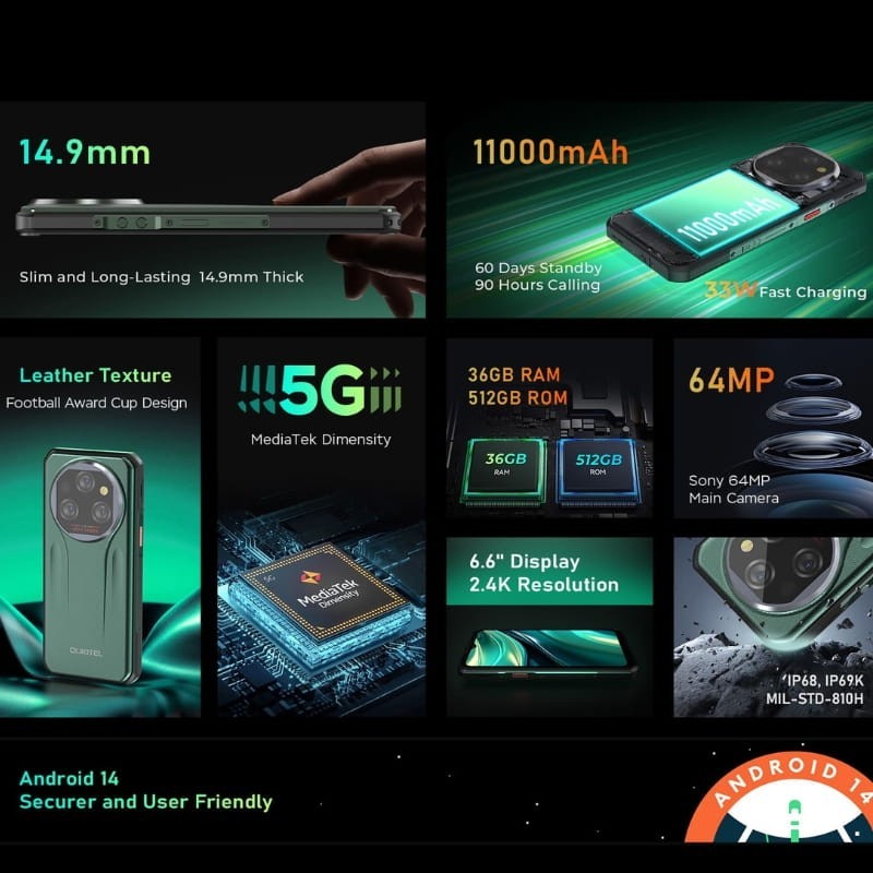 El Oukitel WP39 Pro 5G es el rugerizado más equilibrado de su gama: procesador MediaTek Dimensity 6300+ de 6 nm, 12GB RAM ampliables hasta 36GB, 512GB almacenamiento y batería de 11000 mAh con carga de 33W. Su pantalla IPS FHD+ de 6,6" con Gorilla Glass 5, triple cámara Sony IMX682 de 64 MP + nocturna IR de 8 MP + macro y frontal de 32 MP, junto a Wi-Fi 6, Bluetooth 5.2, NFC, herramientas outdoor integradas y triple certificación IP68/IP69K + MIL-STD-810H, lo convierten en el acompañante perfecto para cualquier entorno extremo. 🛡️⚡📸