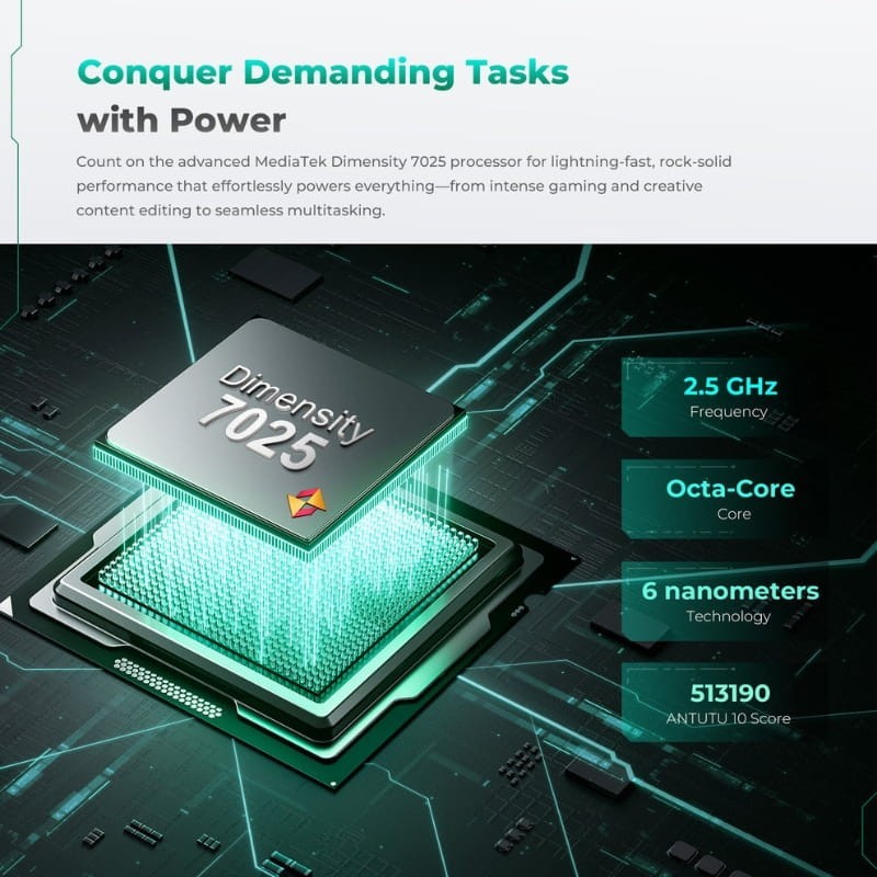 - Procesador (SoC): MediaTek Dimensity 7025 (6 nm) con módem 5G integrado