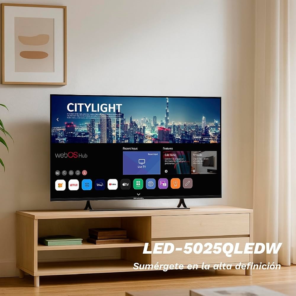 Grunkel LED-5025QLEDW: Smart TV 50" QLED 4K UHD (3840×2160) con webOS, 1.5GB RAM, 8GB almacenamiento. Conectividad completa: 3× HDMI, 2× USB, Wi-Fi, Ethernet. Grabadora USB-PVR, sintonizadores DVB-T2 y DVB-S2 integrados. Audio estéreo 2×10W, ángulo visión 178°. Dimensiones: 111.1×69×23.1 cm, 9.1 kg. VESA 200×200 mm.