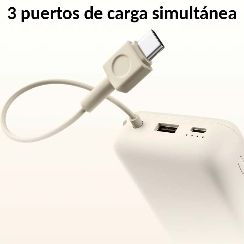 La Xiaomi 33W Power Bank de 20000 mAh permite cargar hasta tres dispositivos al mismo tiempo, gracias al cable integrado, otro puerto USB‑C adicional y un puerto USB‑A, ofreciendo máxima versatilidad para todos tus dispositivos.